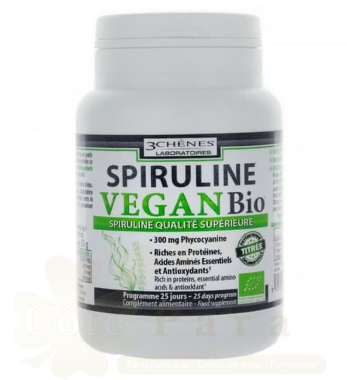 Spiruline Vegan Bio est titrée en chiorophylle, phycocyanine, caroténoïdes.Disponible dans votre parapharmacie en ligne www.cotepara.ma
