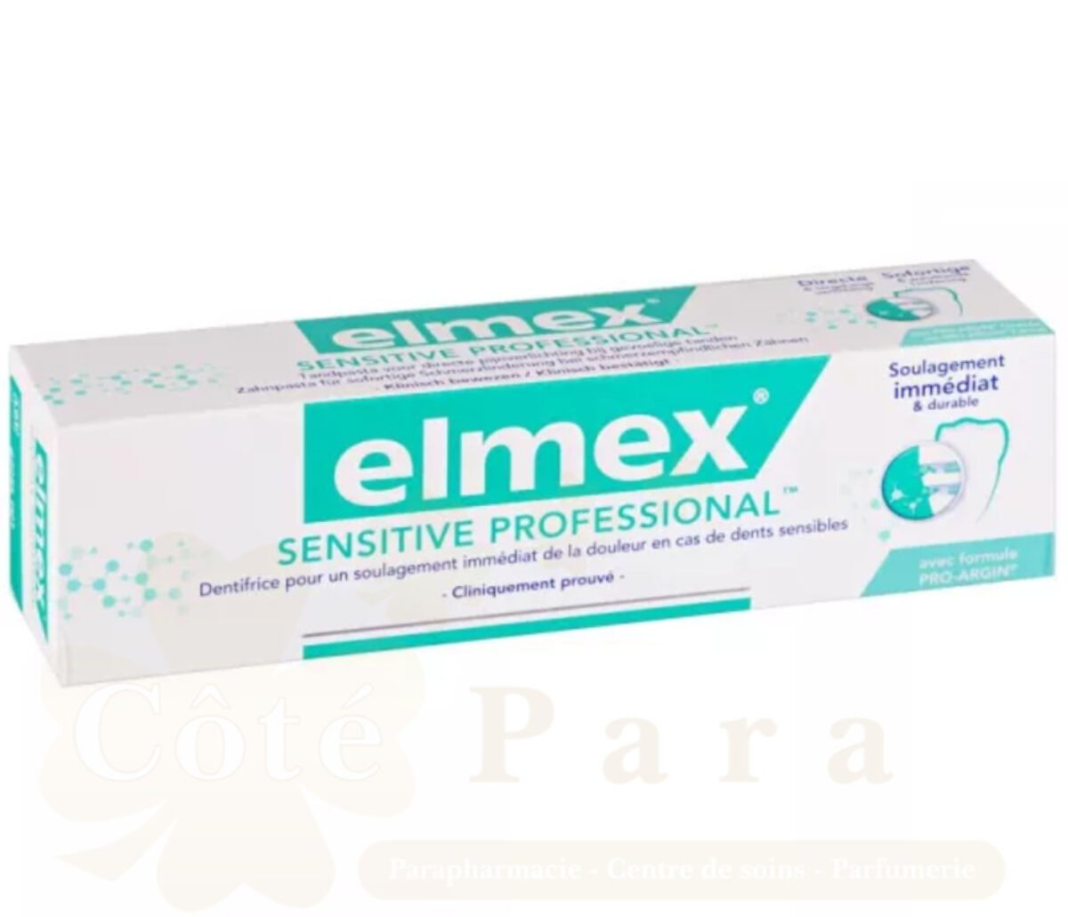 L’ouverture des canalicules dentinaires causée par des collets dénudés ou la perte d’émail conduisent à une hyperesthésie dentinaire. Chez les patients avec des dents sensibles, le contact avec des aliments et des liquides froids ou sucrés peut déclencher de courtes et fugaces sensations de douleur. La technologie PRO-ARGIN contenue dans le dentifrice elmex® SENSITIVE PROFESSIONAL obture profondément les canalicules dentinaires ouverts et élimine ainsi la cause de la douleur.Pour un soulagement immédiat, appliquez ce dentifrice jusqu’à 2 fois par jour, directement avec le bout du doigt sur la dent sensible, en massant doucement pendant 1 minute.